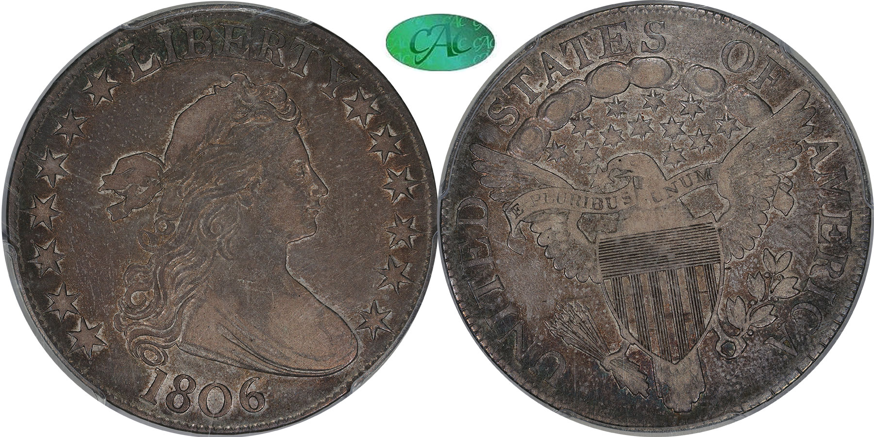 Gem $1600 New February 19! Excellent Eye Appeal, Conservative Grading, Light Gray Patina with Residual Luster, formerly Saco River Collection. After handling a substantial number of 1806 Draped Bust halves, one can quickly discern those with special eye appeal and pristine surfaces. This is the case for this lovely 1806 O-109 half that has been approved by CAC and assigned a Gem quality rating by GFRC. Though graded VF30 by PCGS, there is ample remaining mint frost surrounding the stars, within Liberty's curls and within the reverse legend. Surfaces are entirely blemish free and lustrous during bright light viewing. Housed in 2013 PCGS holder with edge view insert. The blue and white label reads, "Overton 109 Pointed 6 No Stem." A gem offering formerly from the Saco River Collection.