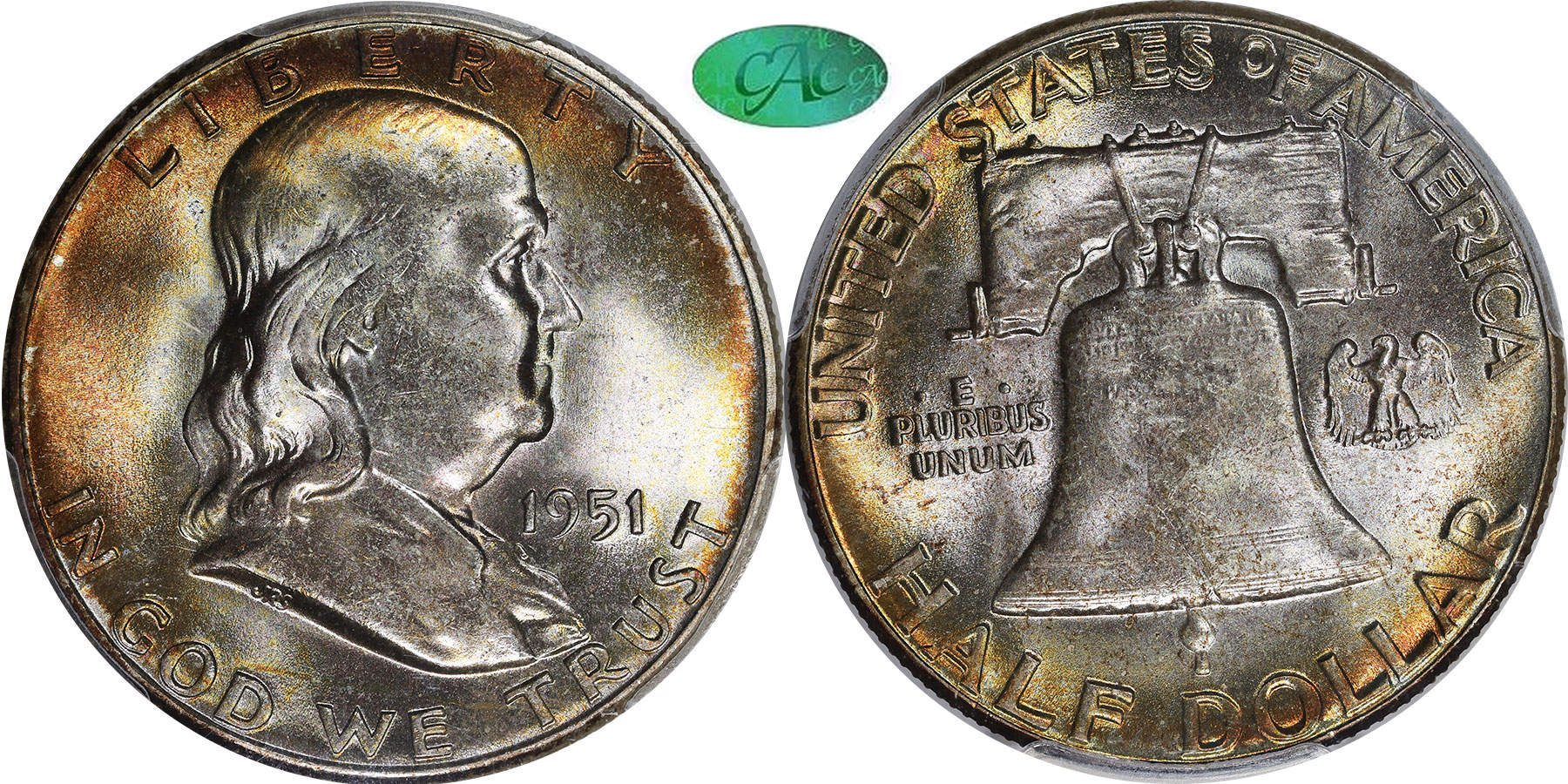 Choice $895 New February 25! Appealing Toning with Excellent Luster. Nicely struck for a non Full Bell Line. Just a little more bell detail and this becomes a $6,000 coin. The color is attractive and not the usual mottled toning that Franklins can have. Rotating this coin under a light brings out the