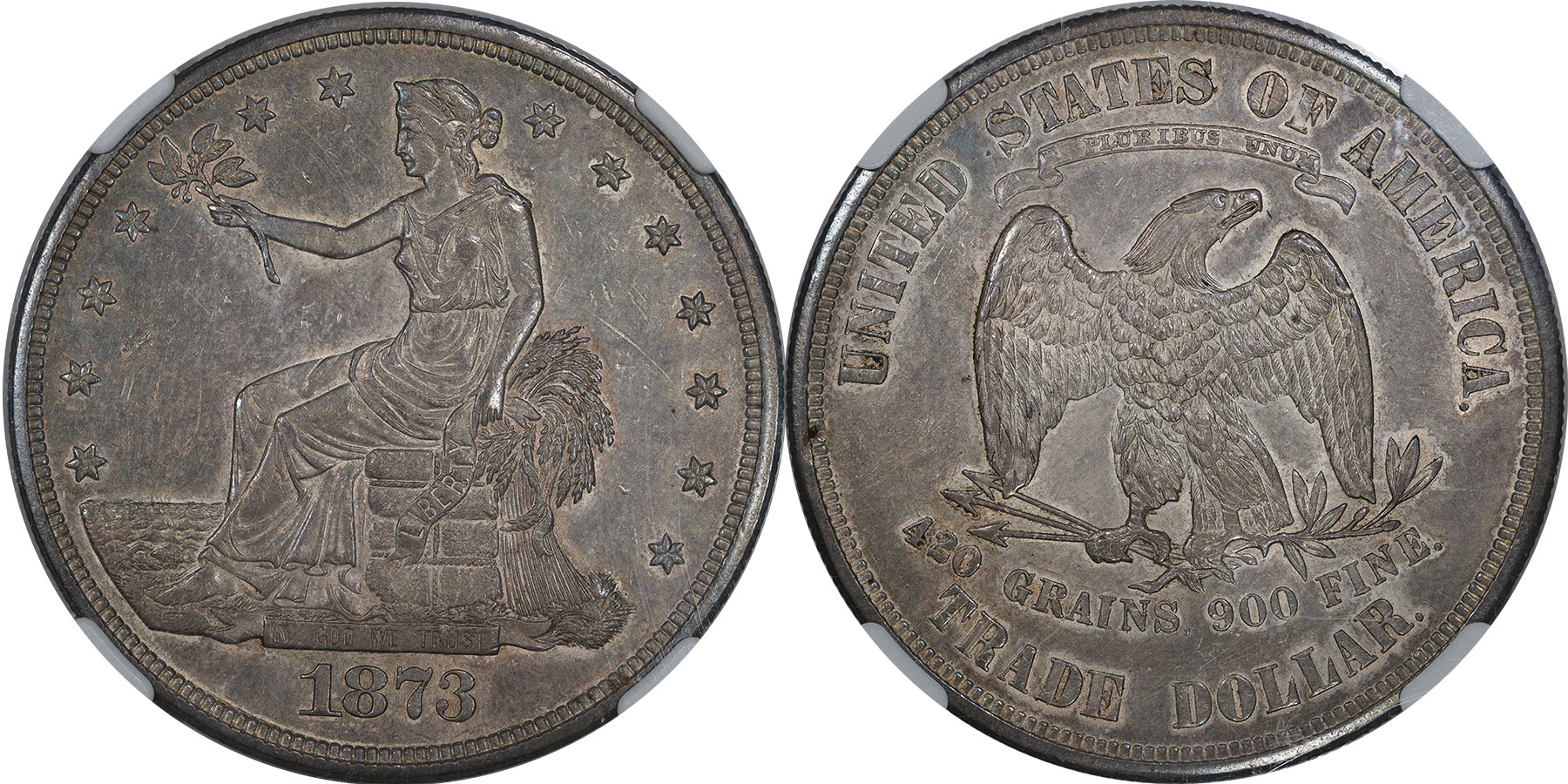 Choice $1200 New March 3! Nice Originality. A very original looking example of this first year Trade dollar. Mint luster peaks out from under the rust blue toning. A few marks can be found in the right obverse field but the rims are unmarked and the strike is excellent. This coin has excellent eye appeal for those that like original looking Trade dollars.