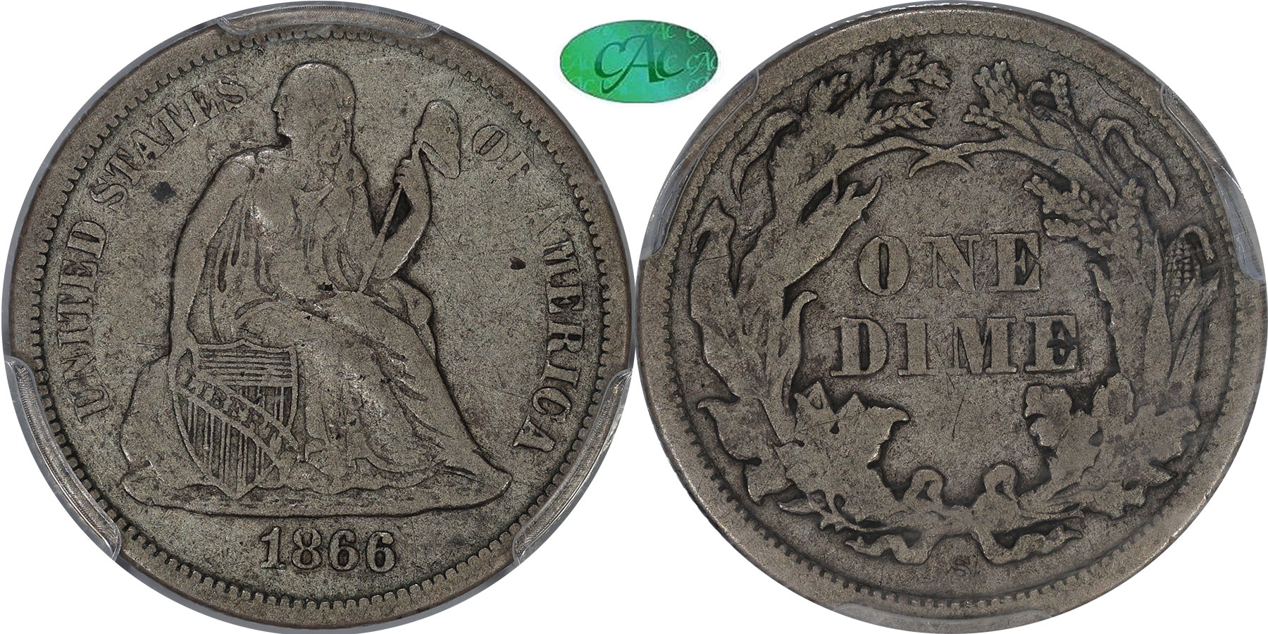 Choice $950 New March 20! Type 2 Reverse, CACd Choice Original, Top 100 Variety. This is the third time this 1876-CC Type 2 reverse example is back on the GFRC price list. This time it comes with a CAC sticker. This coin is slate blue-grey with good eye appeal. This is a scarce and important Top 100 Variety. The PCGS Pop is 2 in 45 with 4 higher. The CAC stickered pop is 3, one in 15, this 45 and one higher in 50. There are two CACG coins in 20 and 25. If you are building a seated dime variety set or want to add a variety coin to your seated dime set, this is your coin.