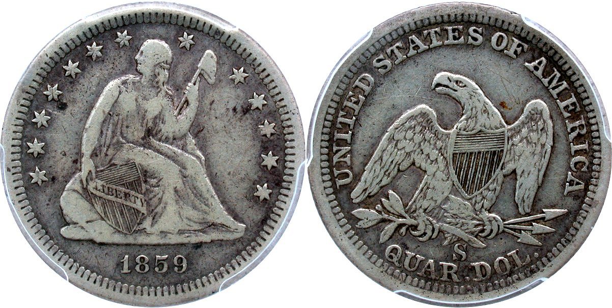 Briggs 1-A Original $1125 Rare San Francisco Date, Light Gray, Bold Devices at Grade. GFRC Cost Basis! - During 1859, the still relatively new San Francisco mint struck only 80,000 Seated quarters. That mintage entered western frontier commerce and remained there for years. Indeed, not even a single Mint State example is known, as no one systematically collected this coinage at the time of issue. Present day collectors struggle to locate the date due to low survival rates. GFRC is pleased to offer this newly purchased example with light gray shades including darker gray at the peripheries. PCGS was tough on this example as there is a substantial amount of device details for the certified grade. A solid example that will fill that long standing hole in a date and mintmark set without breaking the bank. Housed in PCGS Gen 6.0 (2015-2020) holder.
