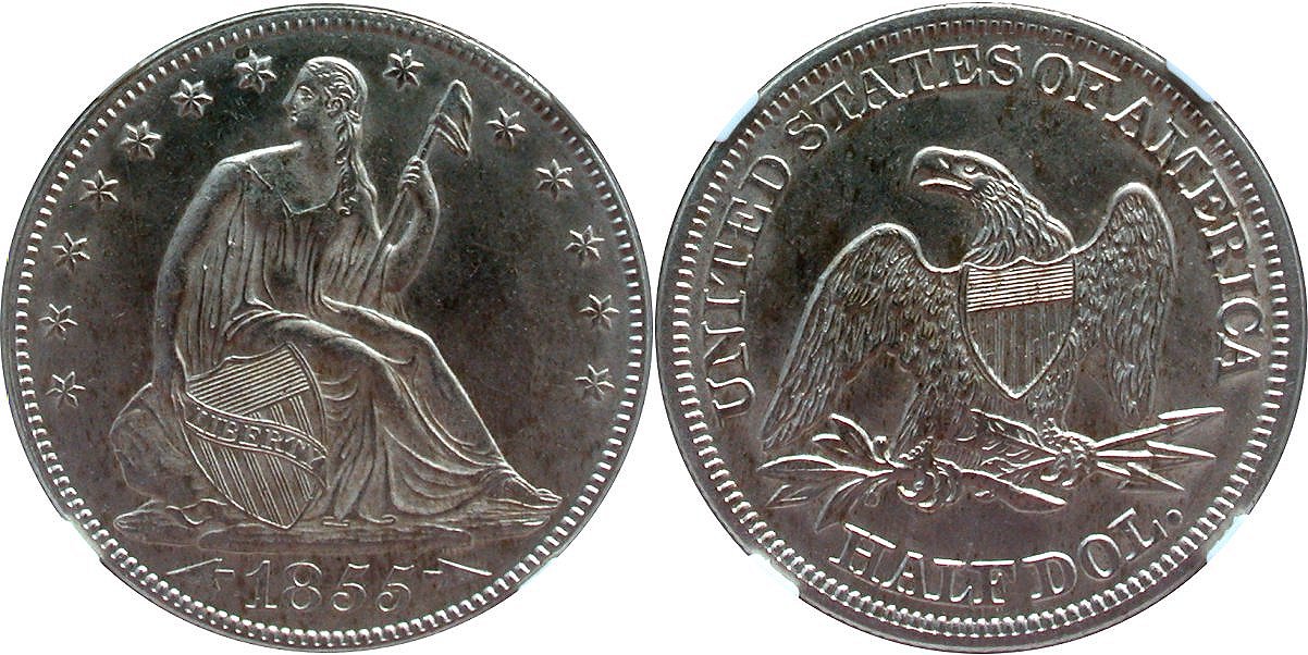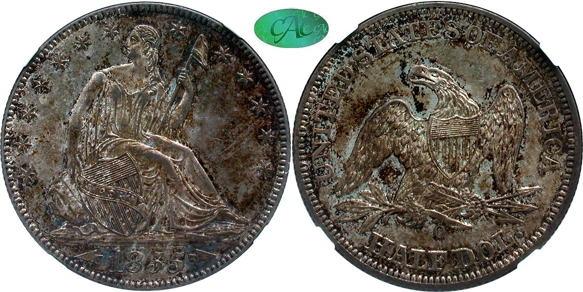 Gem Original, Partially Mirrored, Exceptional Bright Light Eye Appeal, Sooner Collection.. Consignor Price Reduction! - Perfectly original and unmolested gem silver coinage can present challenging toning patterns to the GFRC camera. This gorgeous 1855 New Orleans strike, previoulsy from the Spring Branch Collection, was recognition as being a difficult lot to photograph. However, the proof like fields and outstanding bright light eye appeal make this a compelling lot. GFRC images accurately capture the mottled rose-gray toning as seen during in-hand inspection. Under a bright light, the field offers a steely reflectance Strike is boldly impressed with every miniscule device detail being well defined. A shallow field depression below star 4 is a planchet defect and as struck. This gem belongs in an advanced collections being assembled. Housed in NGC Gen 17 (2004-2008) holder with CAC approval. Now being released by the Sooner Collection after a recent upgrade.