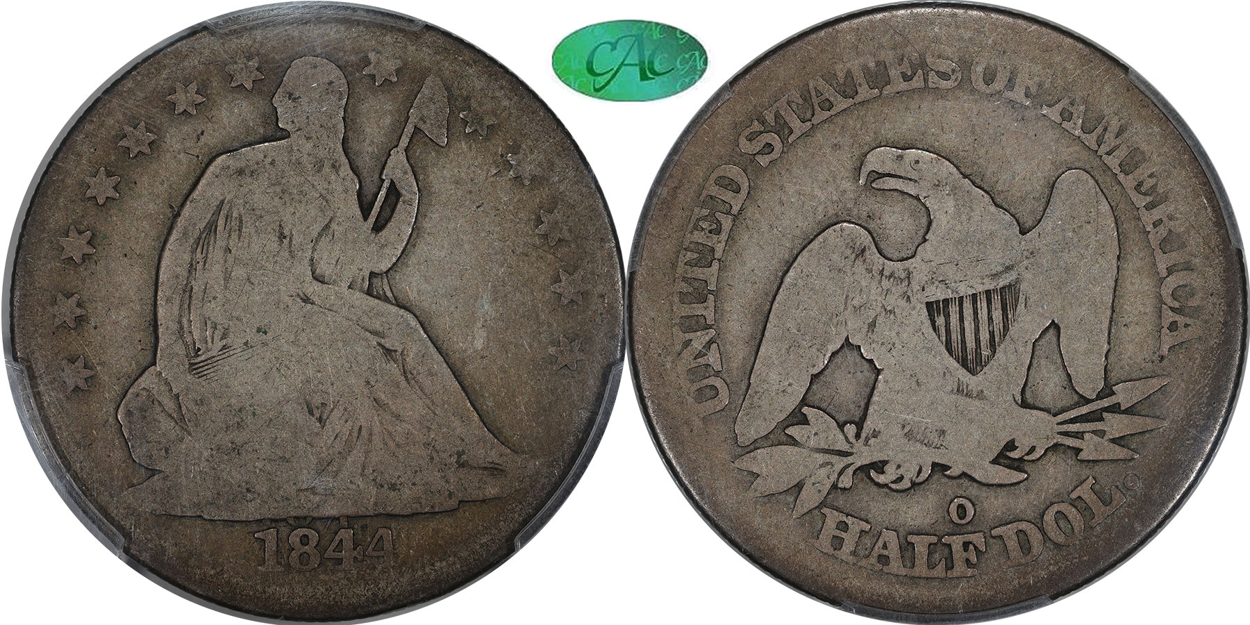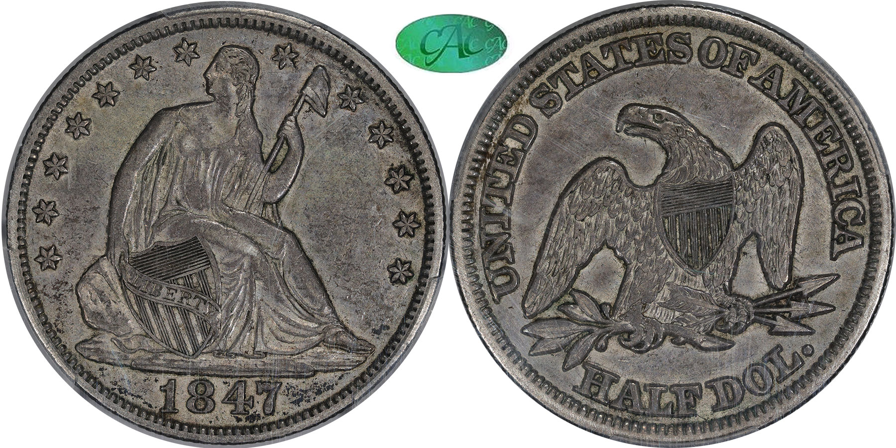 New March 19! WB-9. Cool Reverse Die Crack. Blatant Originality. This WB-7 die marriage (R-3) has a die crack from the rim thru (AMERIC)A into the eagles right wing to shield edge. On the obverse, a large rust lump is clearly visible on Libertys right knee. The coin itself is a near-gem toned in golden grey-brown shades with nice luster under the toning. Well struck with excellent detail remaining with only a few minor imperfections. Even collectors who already own a nice CAC 1849-O half and dont do varieties should consider this coin as a bookend for its neat die crack.