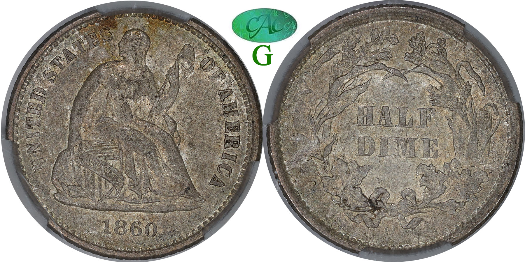 New March 31! Well Struck. Conservative Grading. This better date Seated half dime has very nice eye appeal with its iridecent grey toning over well struck surfaces. Very few marks too. Light wear for the grade confirms CACG's conservative grading.