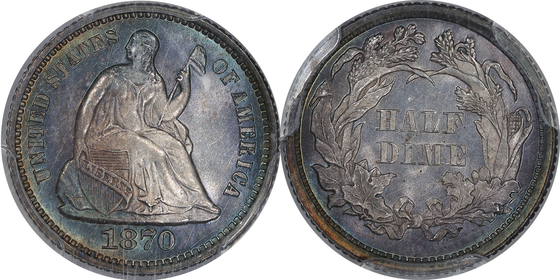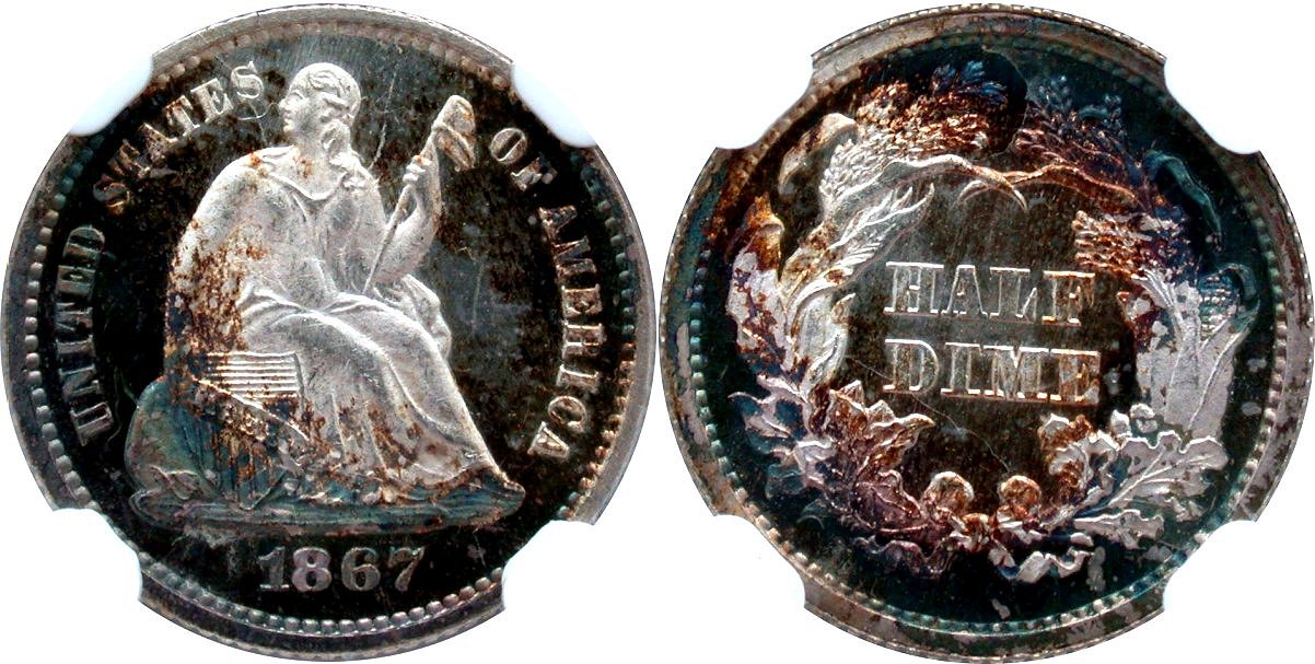 Gem $10100 Condition Census, Key Date, Heavily Striated Dies, Mirror Collection. 2025 Black Friday Sale Offering - The Condition Census 1867 example is the primary highlight of the Mirror Collection release and an important opportunity. showing well-struck devices and sharply reflective fields. This is a beautifully toned coin, the peripheries ringed in iridescent cobalt-blue and reddish-orange patina that frames brilliant centers. A proof like specimen that is fully struck, save for AL of HALF at the center of the reverse. Heavy vertical die striations are prominent under a 10x along with clash marks, which are not unusual for the issue. NGC reports just four 1867 half dimes in Superb Gem condition, two of which are Prooflike. An important acquisition opportunity to collectors to view the Civil War era extending through 1867. Housed in new large font NGC holder.