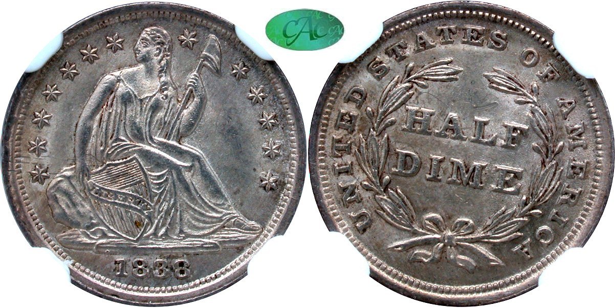 Choice $1285 Creamy Frosted Luster, Complete Strike, Near-Gem, CAC Approved. 2025 Black Friday Sale Offering - A boldly repunched star 8 is readily evident on this superbly preserved 1838 Seated half dime. Radiant mint bloom radiates creamy frosted luster when placed under angled lighting. Strike is fully executed with a reverse die crack through O(F) into the wreath. One reverse field mark holds this piece back from potential higher grade. The eye appeal is certainly there. Newly consigned and a premium example. Housed in new large font NGC holder with CAC approval.