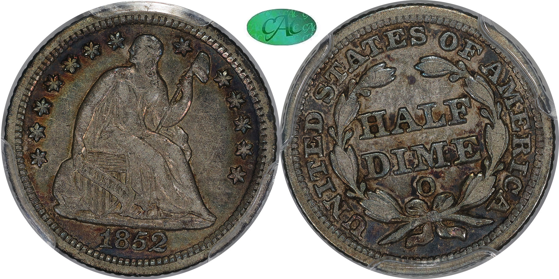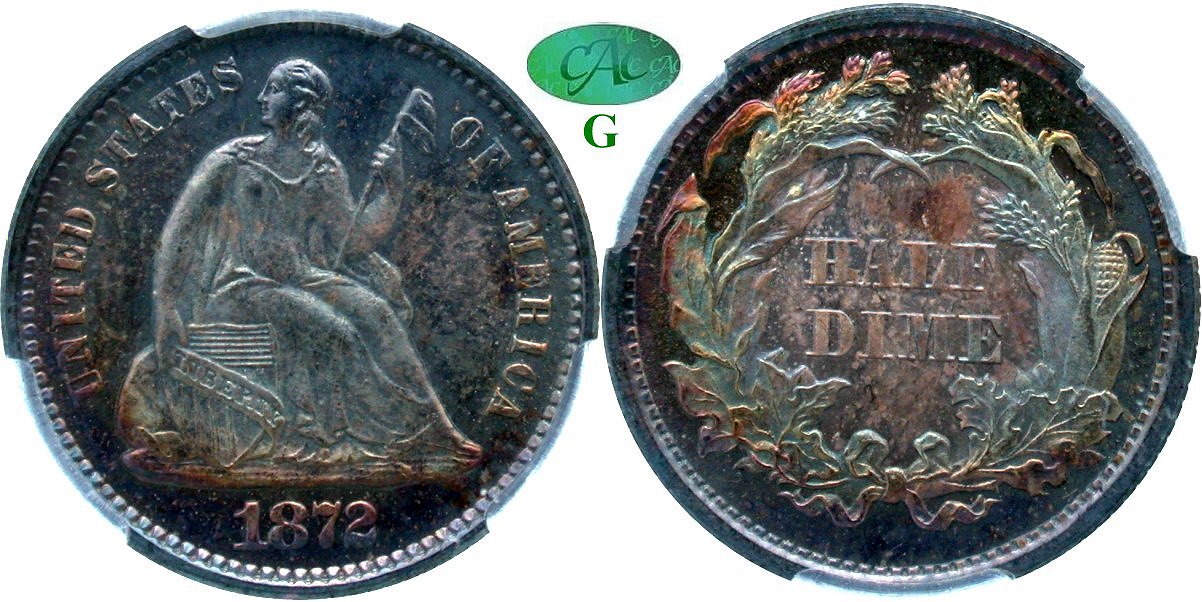 Watery Mirrored, Colorful Presentation, Pristine Surfaces, Fresh CACG Grading. GFRC Cost Basis! - 1872 Liberty Seated half dimes proof strikes totaled 950 pieces. This survivor has been meticulous preserved leading to a host of positive attributes. First are the watery mirrors noted under a bright light along with colorful toning that consists of blues, aquamarine, and gold on the obverse while the reverse presents a rose center surrounded by green-gold overlaying the wreath. Second are the pristine surfaces without any traces of a single hairline. Finally, the strike is fully executed along with partial wire rims. The watery mirrors will be thoroughly enjoyed under a bright light. The lovely little half dime has been conservatively graded and is housed in new CAC Grading holder and graded consistent with CAC approval standards.