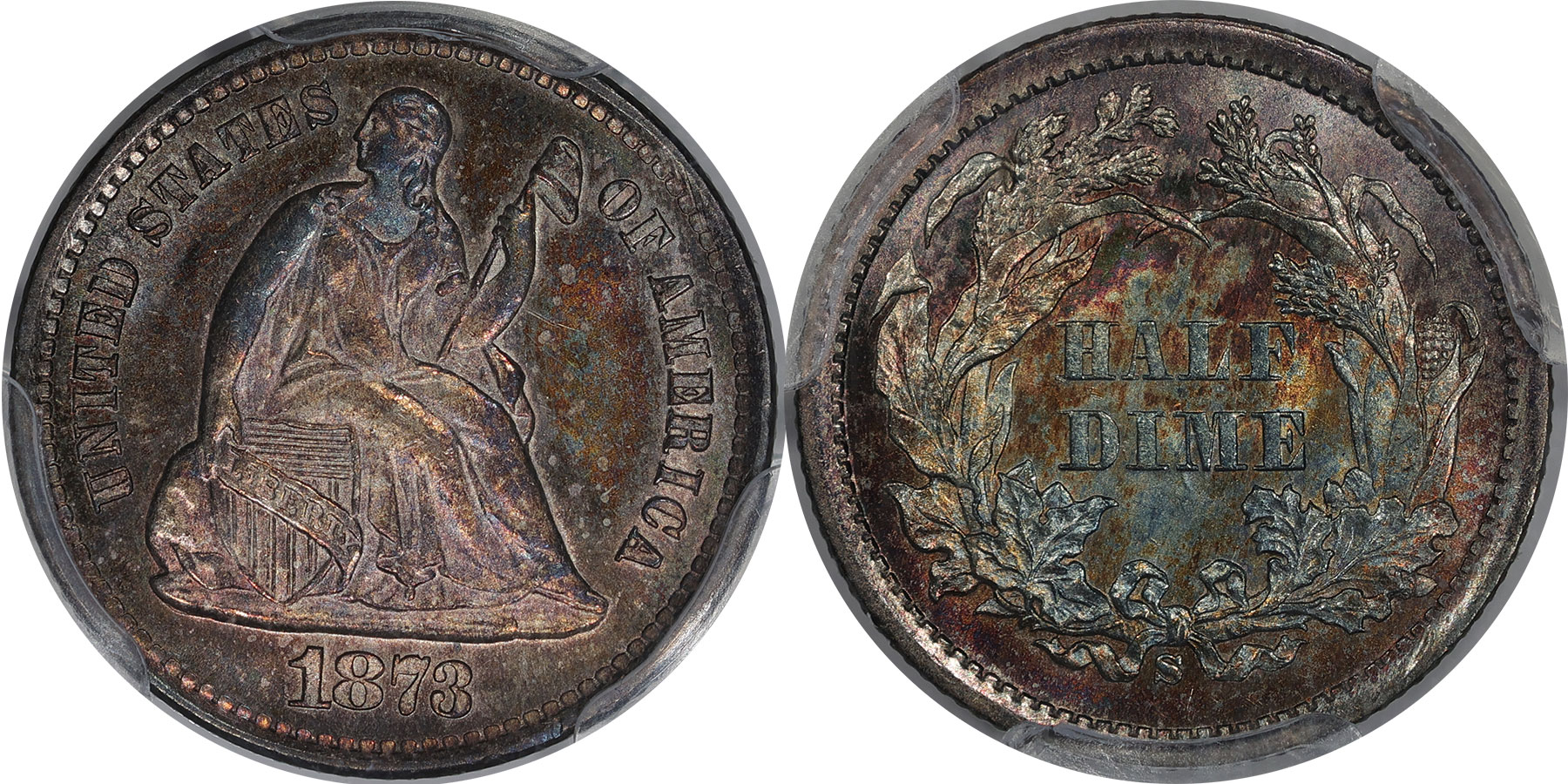 New February 27! Excellent Color over Lively Surfaces.. Exceptional eye appeal graces this modest grade better date seated half dime. Steel blue in the field with redish irredecence in the stars. Well struck too.