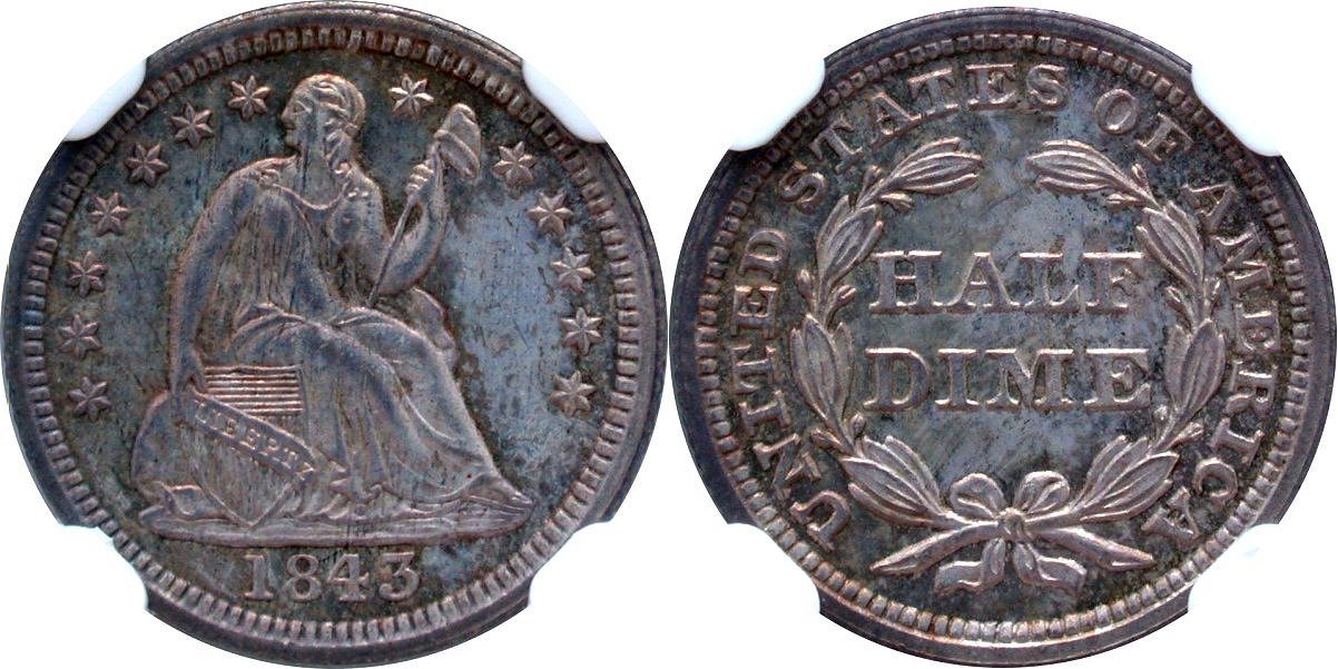 Gem $1475 Gem Original Example, Steely Reflectance, Hammered Strike, Mirror Collection. 2025 Black Friday Sale Offering - The 1843 Philadelphia half dime date falls into the "common" category with a mintage of slightly over one million. In full gem or better, the date becomes scarce. The Mirror Collection is releasing a GFRC-Gem rated example with orange-gray hues and a strong showing of steely reflectance. Vertical die striations are noted with a 10x under a bright light. Strike is hammered with all device fully impressed. The NGC grading is accurate for this strictly original offering. Housed in new large font NGC holder.