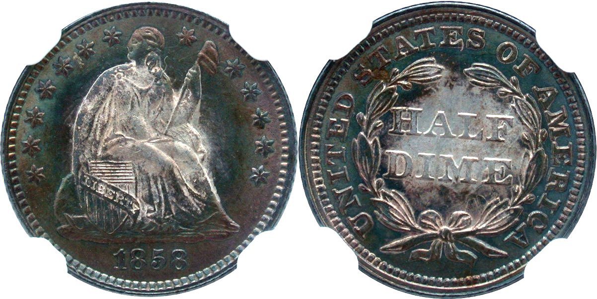 Gem $920 Superb Eye Appeal, Frosted Luster, Vibrant Cartwheels, Unquestionable Gem, Mirror Collection. 2025 Black Friday Sale Offering - The 1858 Seated half dime is one of the more common dates in the series and ideal for type. This impressive Mirror Collection release offers superb eye appeal including brilliant frosted luster and vibrant cartwheels. The bullseye toning features an essentially untoned center surrounded by an initial green ring that transitions to pewter-gold at the peripheries. The overall strike is deeply impressed with heavily clashed dies on both sides. Wire rims are also noted. The PCGS price guide has recently been updated $1200 with this lot's offer price being very fair for the overall presentation and eye appeal. Housed in new large font NGC holder.