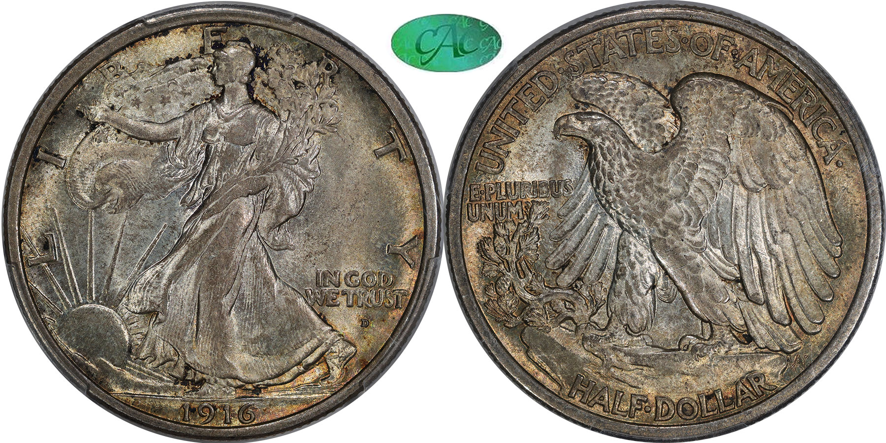 Gem $2850 First Year Denver Design Issue, Pretty Golden-Rose Shades, Gem Original. GFRC Cost Basis! - The 1916 Philadelphia and Denver struck Walking Liberty halves have comparable rarity in the higher Mint State grades. I could not resist adding this notable gem Denver example to inventory. A well frosted example with radiant luster and the expected cartwheels given a moderate golden patina that turns to rose closer to the peripheries. If luster and superb eye appeal are your cup of tea, this new offering might warrant a closer look. Housed in PCGS Gen 6.1 (2020-2023) holder with CAC approval.