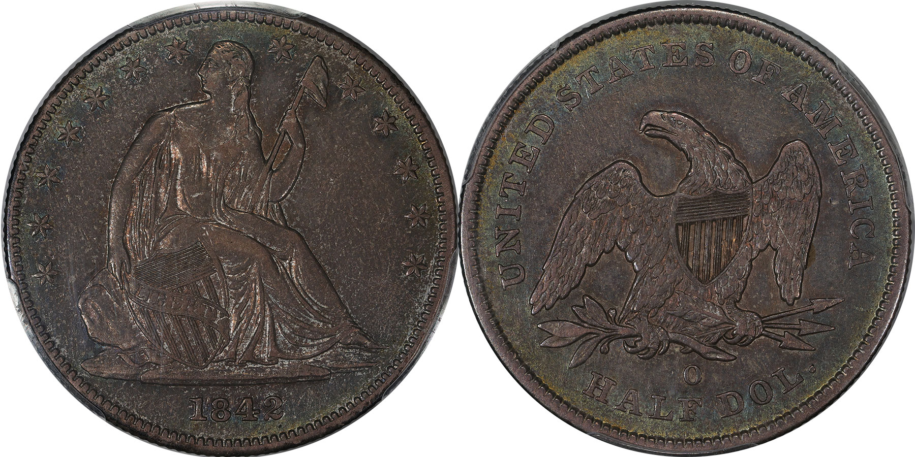Choice $6950 New February 19! Tough Variety in a High Grade with Attractive Rim Toning. 1842-O Small Date half dollars with the 1839 reverse is a scarce and important Red Book variety for Seated Half Dollar die variety collectors. This well struck coin is darker toned with attractive blue and yellow-green rim toning. There are 3 PCGS AU50 examples with just 9 graded higher. Finding a CAC example at this high grade for this issue is easily a five figure coin.