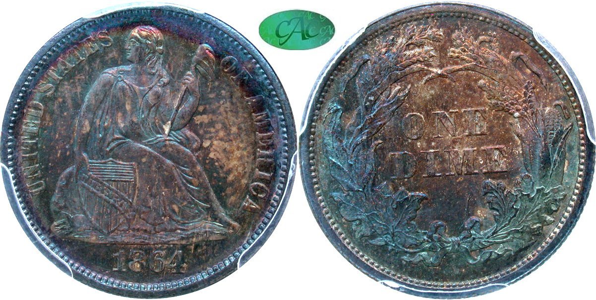 Gem $15000 Gem Original, Newtown Collection. Lightly mirrored, reflective luster penetrates the thick colorful toning of this Civil War piece. Aqua and russet patina predominate, with neon shades additionally present above the figure of Liberty. F-101a, with a defect at the upper right of O(NE), the same reverse die as used in 1863. Clashing is evident beneath DIME. This piece is tied for finest known at CAC with three other pieces. The overall CAC population is 24 pieces, and the CAC price guide is $7,200. Ex. GFRC. This piece represent yet another exceptional gem from the Newtown consignor, a pedigree that will long be remembered among Seated dime specialists. Housed in a PCGS Gen 6.0 (2015-2020) holder with CAC approval.