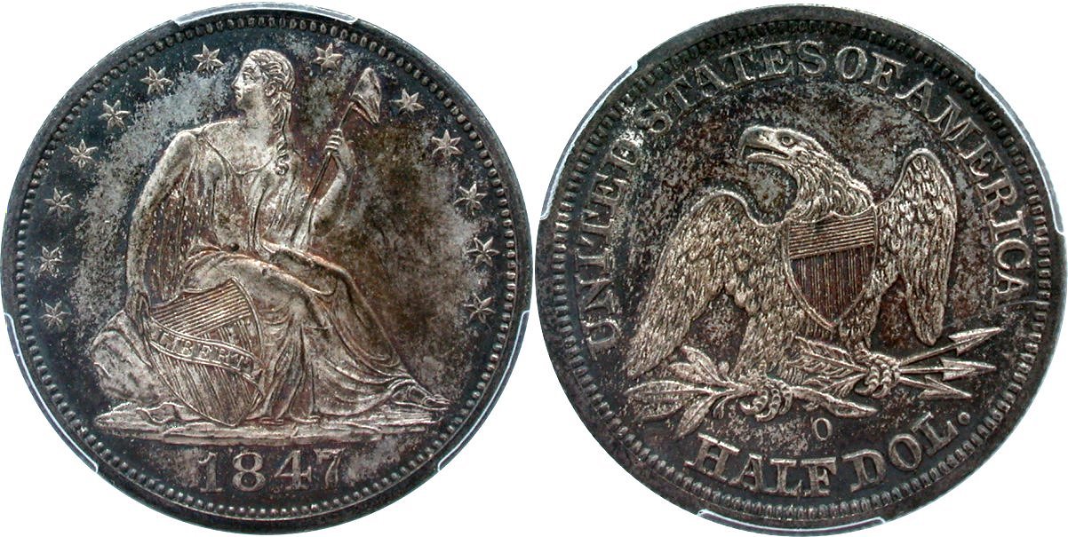 WB-2 Gem $14750 Condition Census, Superb Gem Original, Steely Reflectance, New Orleans Collection. Final Consignor Price Reduction - The New Orleans Collection makes a splash with the release of one of the finest 47-O half dollars extant, with just a single MS65+ graded finer at PCGS. While the mintage of 2,584,000 was sizable for the era, Mint State survivors are unfrequently encountered with any Mint State example being an important rarity in MS64 or finer. Our WB-2 example excels under a bright light with steely reflective fields that are the epitome of undisturbed viewing. The luster is uniform on both sides and a further testament of the unquestionable originality. Though the GFRC images indicate darkly toned surfaces, bright light inspection is a completely different experience with light pastel rose and sky blues dominating the luster. Reverse presentation is similar with golden hues within the legend lettering. The strike is complete and the fields are pristine. This coin has all the hallmarks of a gem and is in the condition census. Advanced Liberty Seated half dollars collectors should take note as the PCGS price guide is $22,500 as reference. Housed in a PCGS Gen 6.1 (2020-2025) holder.