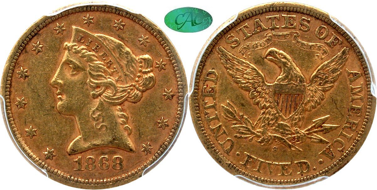 Choice $5525 Rare Grade, Choice Original, White Pine Collection.. 2025 Black Friday Sale Offering - Pinkish-orange patina fills the rims and protected areas of this low-mintage San Francisco piece, contrasting with the steely gold fields. Survival of 19th century branch Mint coinage is often a matter of chance, and CAC reports only a single Mint State piece, MS62, which the CAC guide prices at a whopping $72,000. This piece remains well-advanced within the CAC condition census, bested by only four pieces in AU58 and the single MS coin. CAC has approved 19 coins total, and the CAC price guide value in AU55 is $6,000. While finest known status confers the all-important bragging rights, we would rather own, for the same money, a dozen coins like this AU55 example, as opposed to a single piece graded only a few points finer. Housed in a PCGS Gen 6.0 (2015-2020) holder with CAC approval.