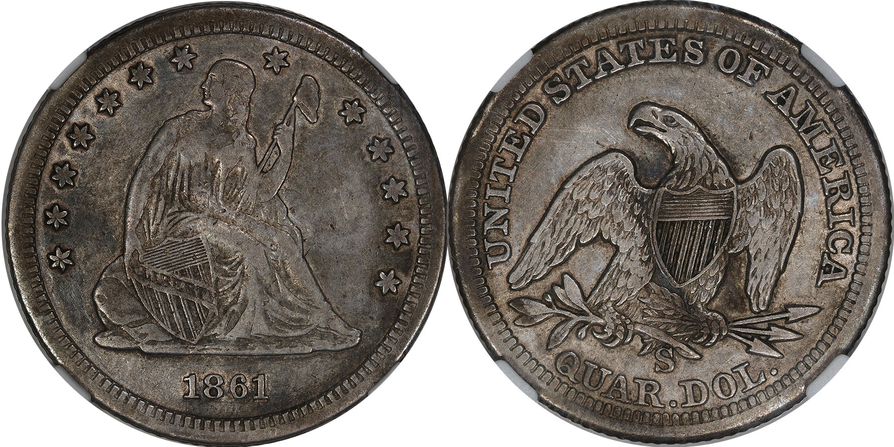 Briggs 2-B Original $2875 New March 19! Key San Francisco Date, Residual Frosted Luster, LaSalle Collection. Consignor Price Reduction - 1861 San Francisco Seated quarter offering which brings the distinction of being the key west coast mint date in the series. Mintage is documented at 96,000 units with few saved from California gold mining town commerce. Nearly the entire mintage was placed into circulation and remained there until well worn or lost. This survivor is noteworthy for its limited wear and residual frosted luster under a bright light. Device are bold and well defined for the issue. Light gray toning covers both sides with enhanced ebony on the central reverse. Examining the PCGS population report, this date thins out quickly at the VF35 to EF45 level with few finer. This LaSalle Collection release is an important opportunity for the advanced collector. Housed in new large font NGC holder.