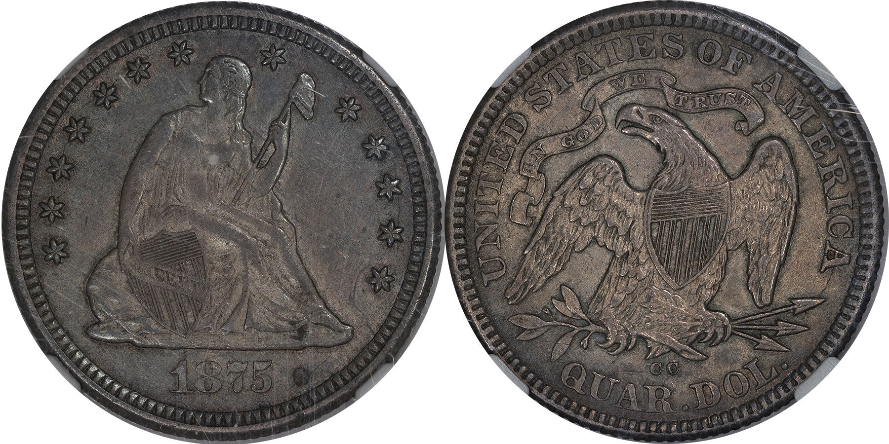 Briggs 2-B Choice $3995 New March 19! Underrated Date, Choice Original, Crusted Gray Patina, LaSalle Collection.. Consignor Price Redution - The 1875-CC issue can be overlooked, standing beside the giants of the 1870-1873 Carson City run. This piece is scarce in its own right with a relatively low mintage of 140,000 pieces, and all Carson City issues have a special appeal within American numismatics. So noted for this new Lasalle Collection consignment. A thick coin gray patina nicely protects the obverse while a light reverse center provides access to the soft frosted luster. The Type II reverse is typically struck with residual mint frost evident within the protected areas. Housed in new large font NGC holder. PCGS #5499.