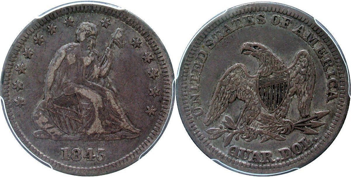 GFRC Open Set Registry - BIG BLUE 1841 Seated  25C 1-A. Doubled Die Reverse showing doubling around the D of UNITED and STATES OF AME.... This strong speciman has original olive-gold color.